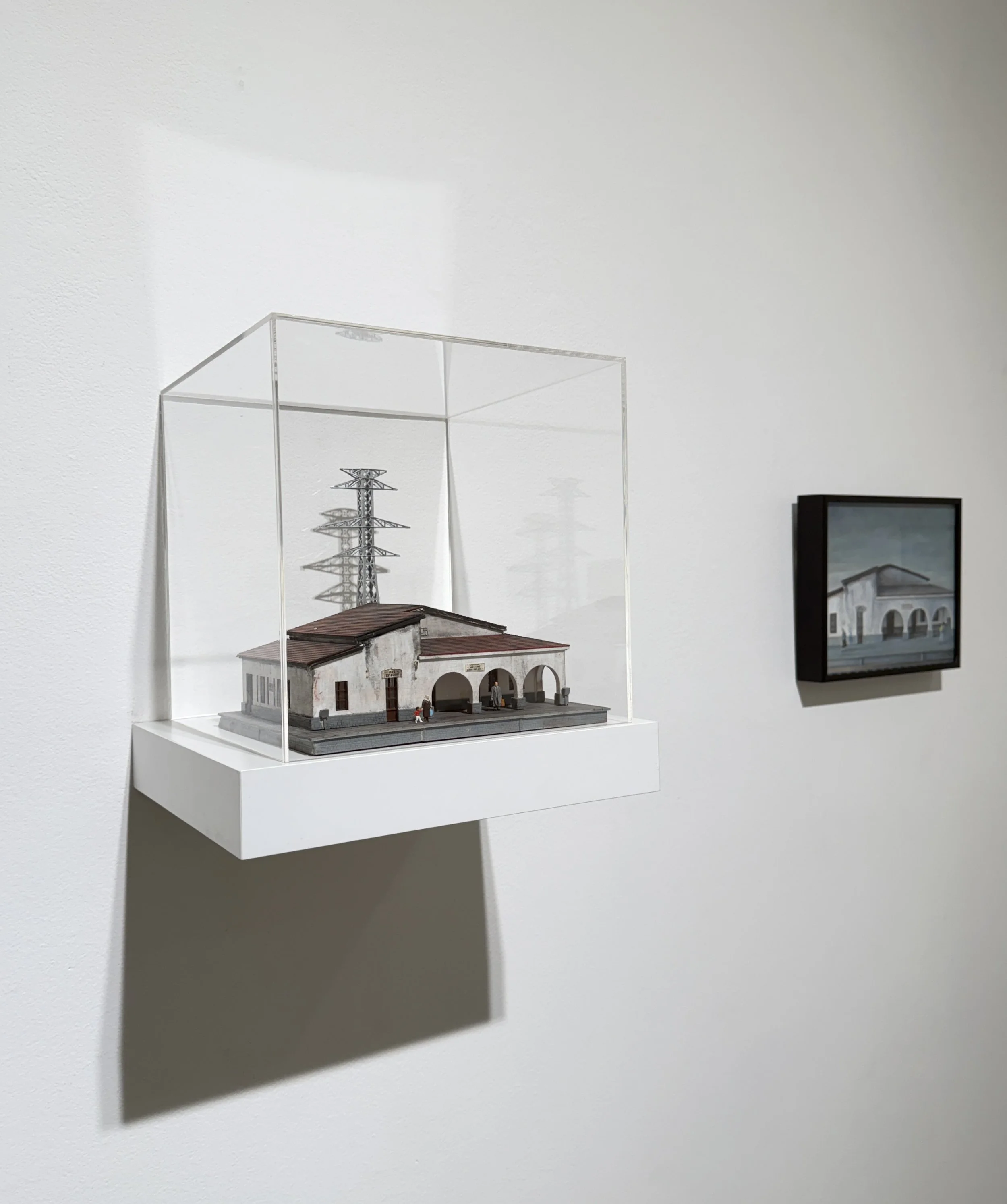 Before starting a painting, Pearlin creates a 3-D diorama, using figures and structures that were originally manufactured for model railroad scenes. She then takes photographs of the diorama, eventually selecting one to use as a reference for the painting. She keeps the paintings small in scale in order to support the illusion of a world that is ambiguously real.